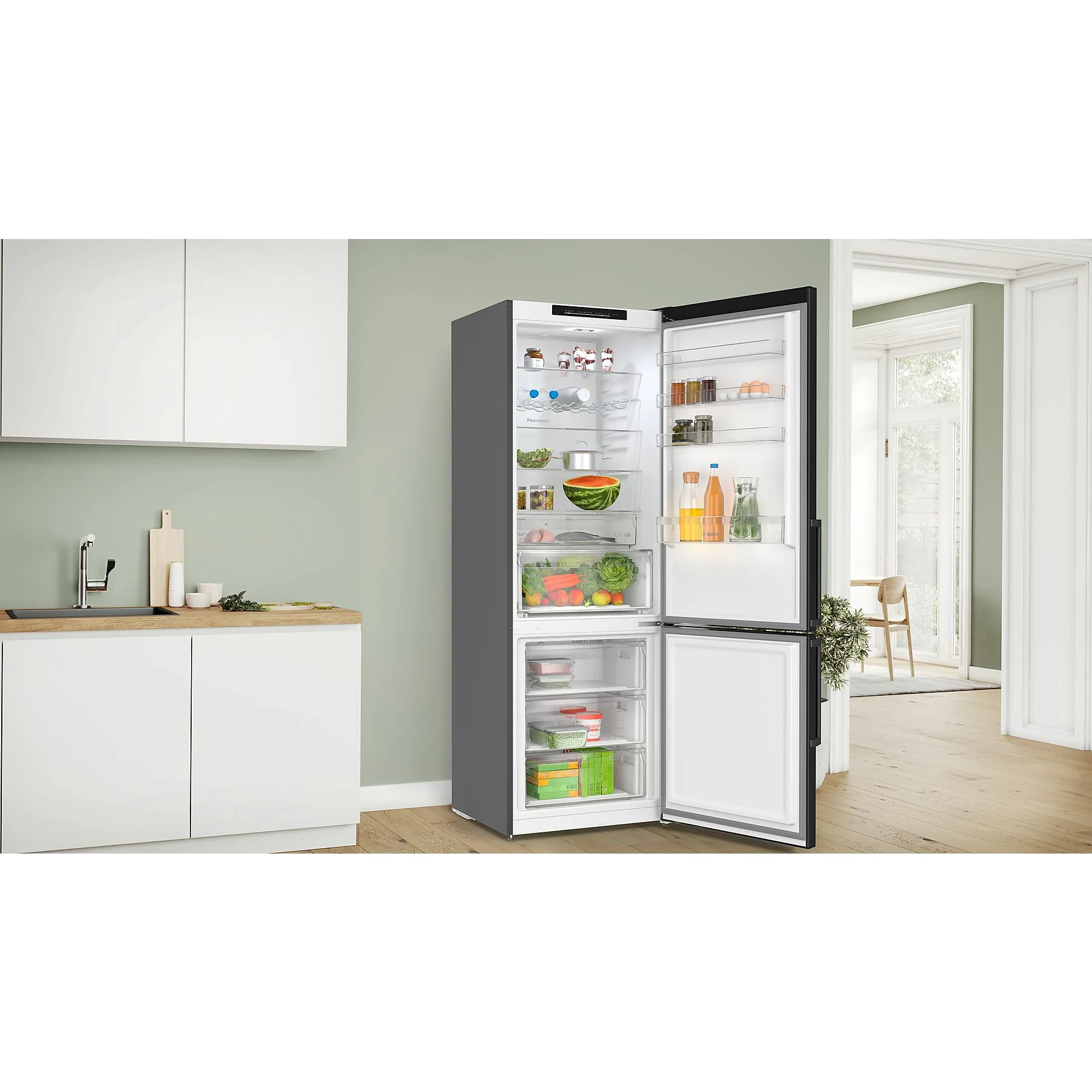 Frische, Übersicht und leise Präsenz in der Küche: Diese Kühl‑Gefrier‑Kombination schafft mit großzügigem Stauraum und klarer Struktur Ordnung im Alltag. Die VitaFresh XXL-Zone hält empfindliche Lebensmittel in luft- und temperaturkontrollierten Schubladen länger knackig, während die LED-Beleuchtung alles hell ausleuchtet.