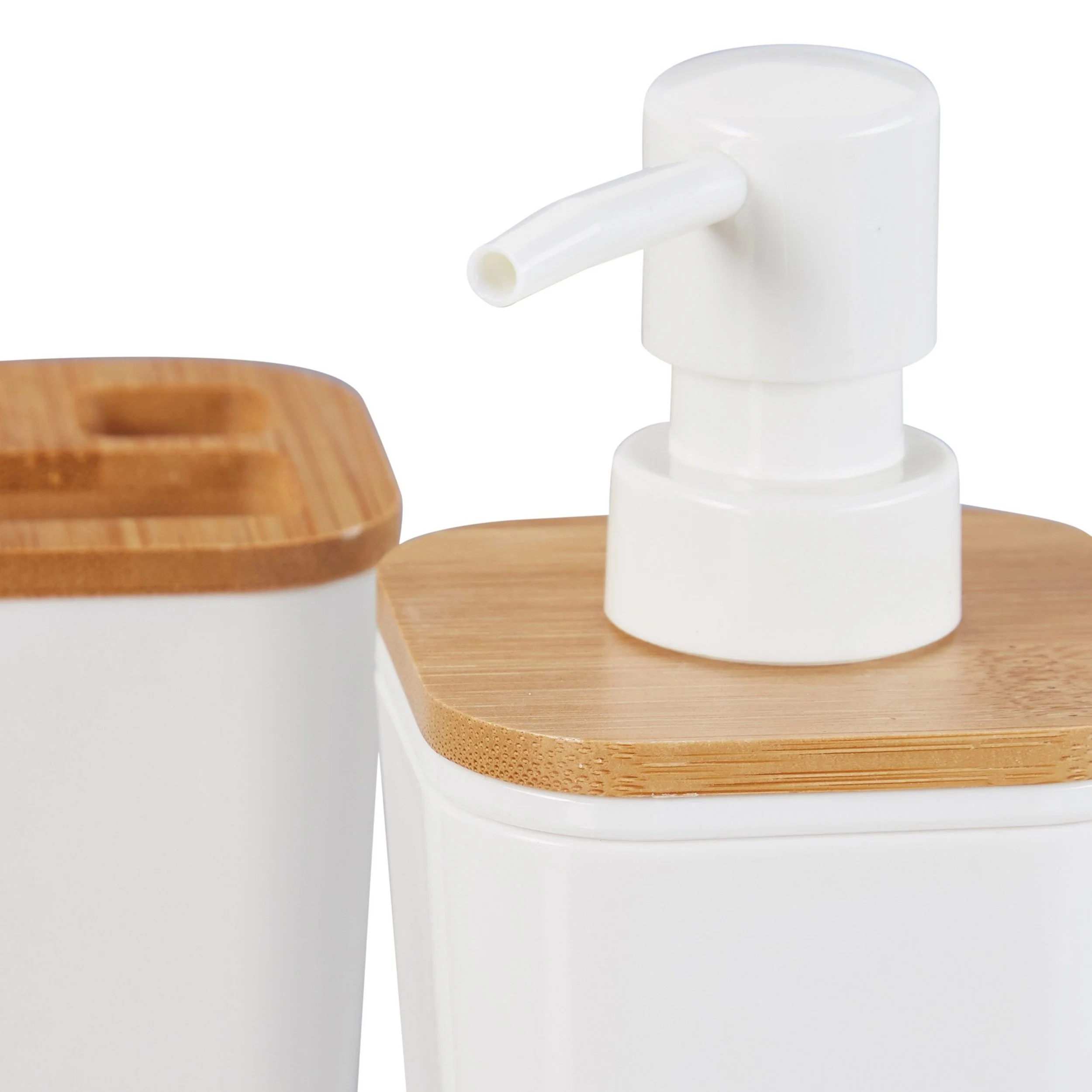 Seifenspender • Seifenschale mit Abtropfgitter • Zahnbürstenhalter • Badbecher – modernes Design in Weiß & Bambus