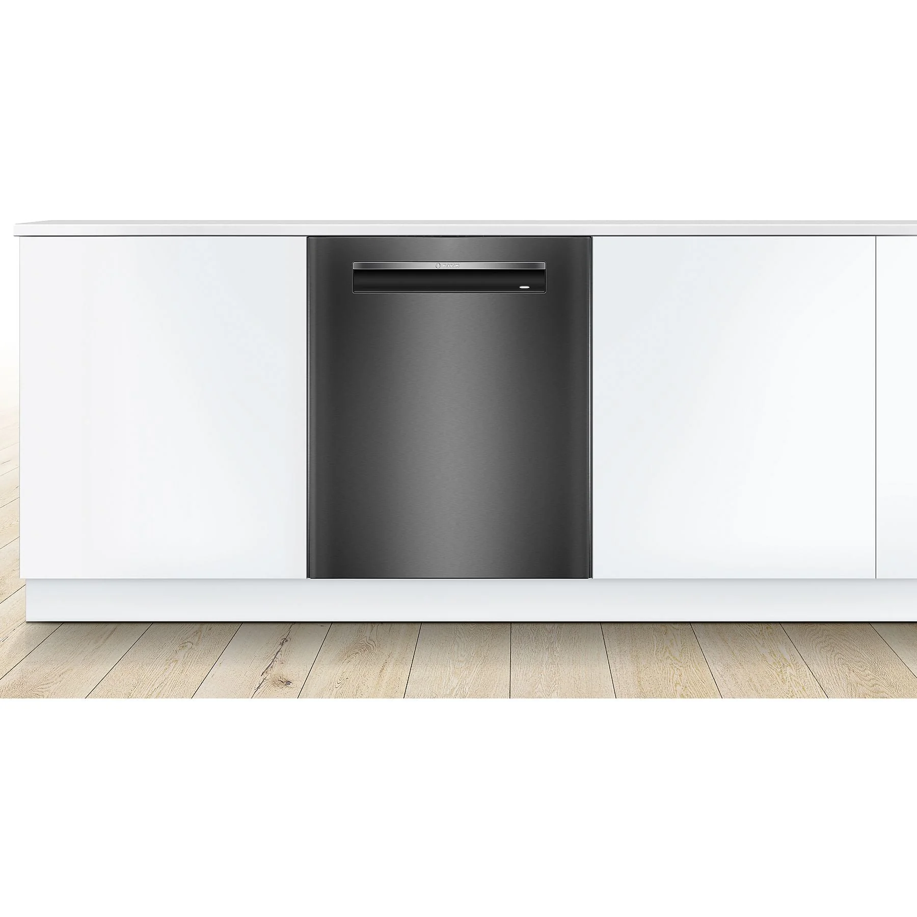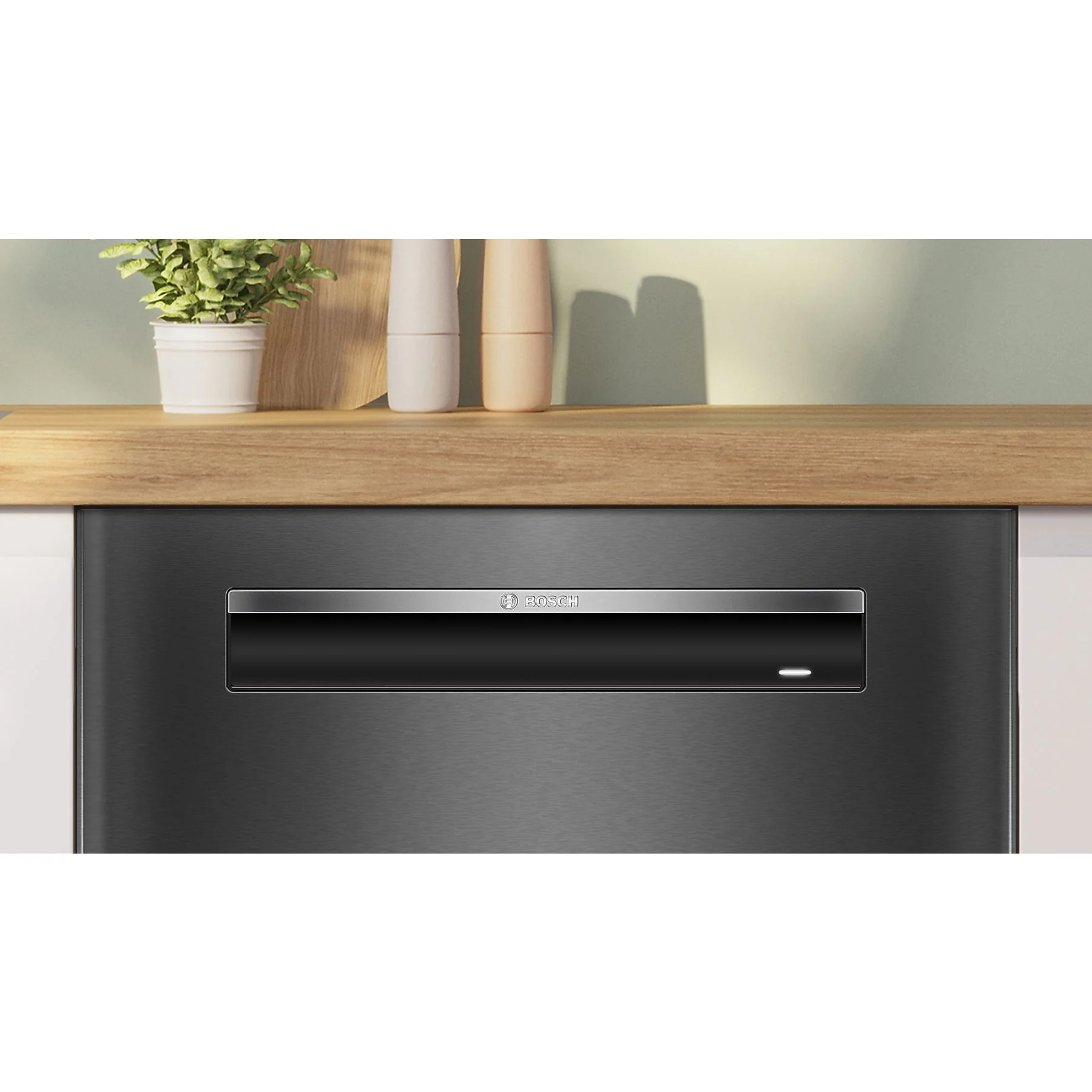 Der BOSCH SMP4ECC71S aus der Serie 4 ist ein unterbaufähiger Geschirrspüler im 60‑cm‑Format, ausgeführt in gebürstetem schwarzem Stahl mit Anti‑Fingerprint. Das Gerät kombiniert eine von oben bedienbare, verdeckte Steuerung mit einem bündigen Einbaukonzept unter der Arbeitsplatte. Funktionen wie Efficient Dry mit automatischer Türöffnung, Max Flex Körbe mit leicht laufenden Rollen und die Home Connect Anbindung unterstützen alltagstaugliche Abläufe. Mit 14 Maßgedecken, 42 dB(A) und sechs Programmen deckt der Geschirrspüler typische Haushaltsanforderungen ab.