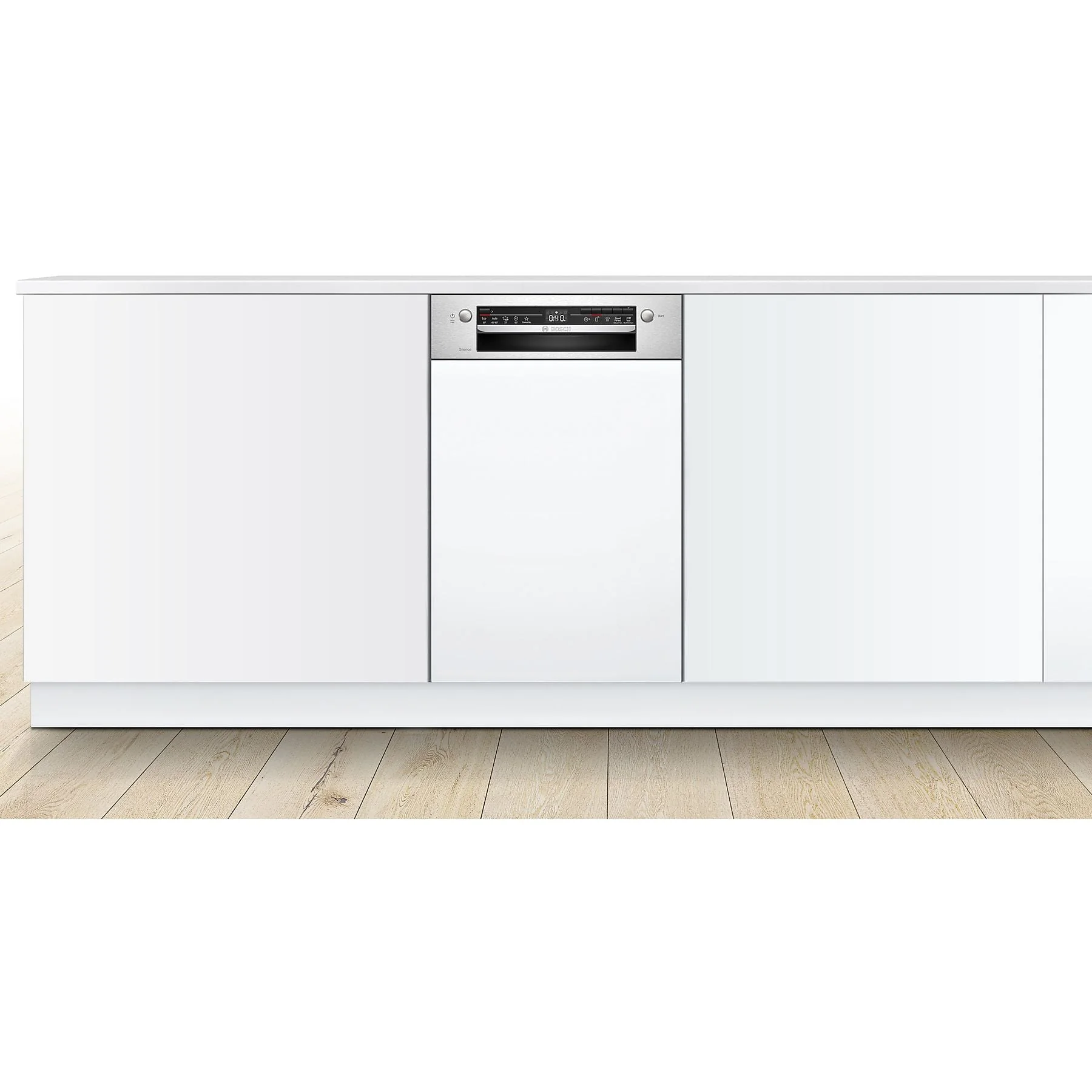 Der teilintegrierte Geschirrspüler Bosch SPI2IKS10E (Serie 2) bringt zuverlässige Spülleistung in schmale Nischen und lässt sich mit einer passenden Möbelfront in die Küche einfügen. Er bietet Platz für 9 Maßgedecke und deckt mit vier Temperaturstufen von 45 bis 70 °C ein breites Spektrum an Anforderungen ab. Dank Home Connect ist das Gerät per WLAN app-steuerbar; zusätzlich steht Bluetooth zur Verfügung. Ein EcoSilence Drive Motor, Aqua- und Beladungssensoren sowie DuoPower Sprüharme im Oberkorb unterstützen eine gleichmäßige Reinigung. Der durchschnittliche Wasserverbrauch liegt bei 9,5 Litern pro Zyklus, die Luftschallemissionen betragen 48 dB(A).