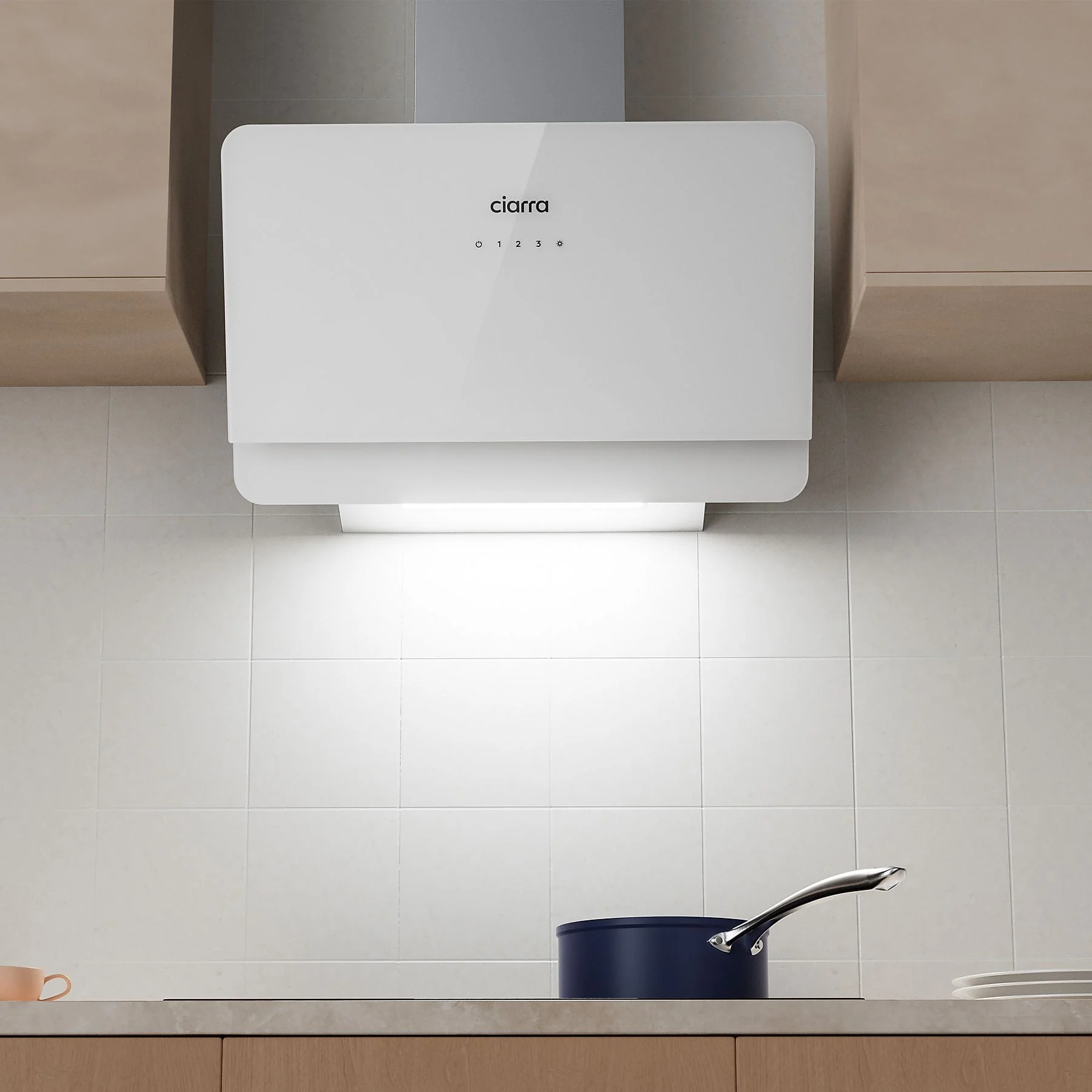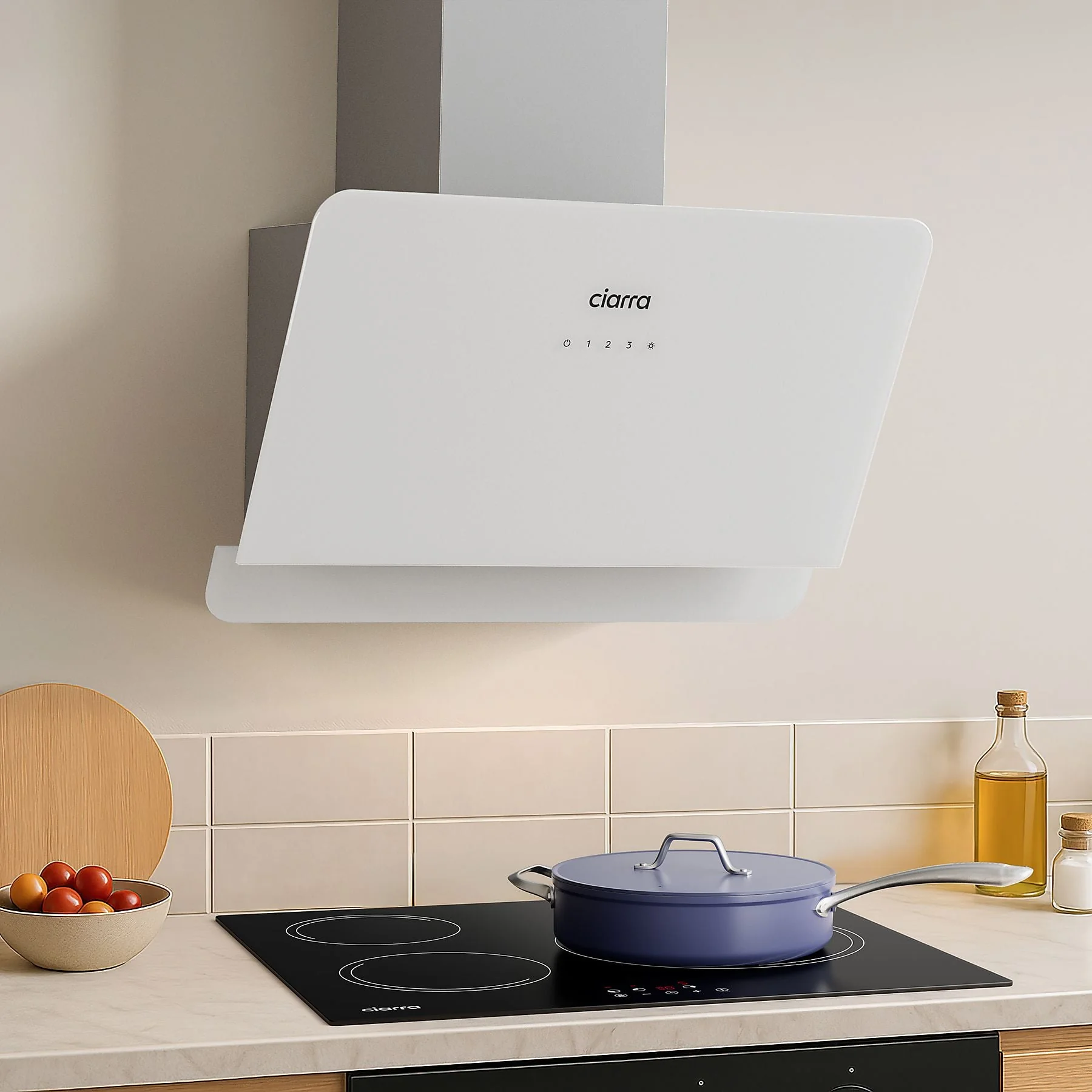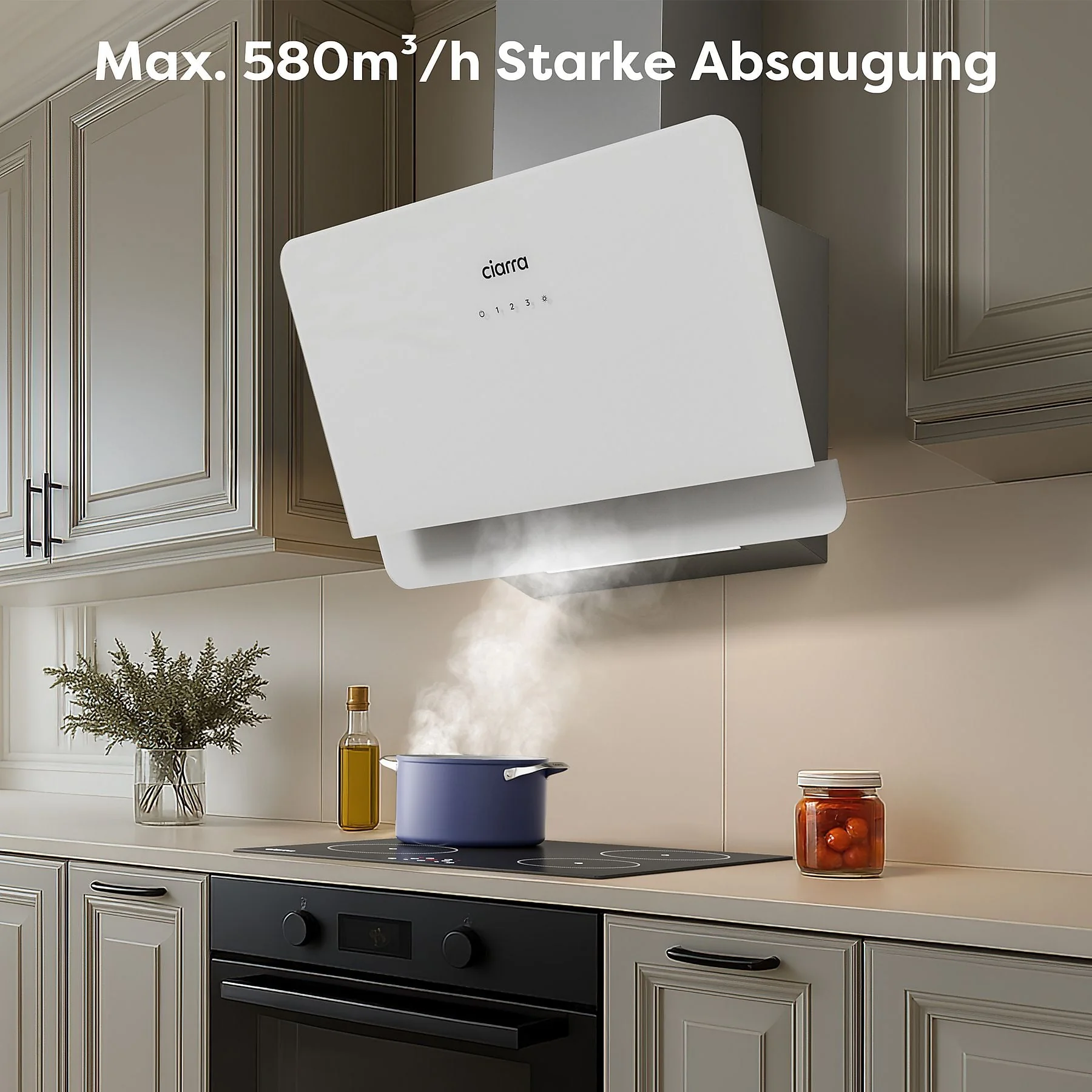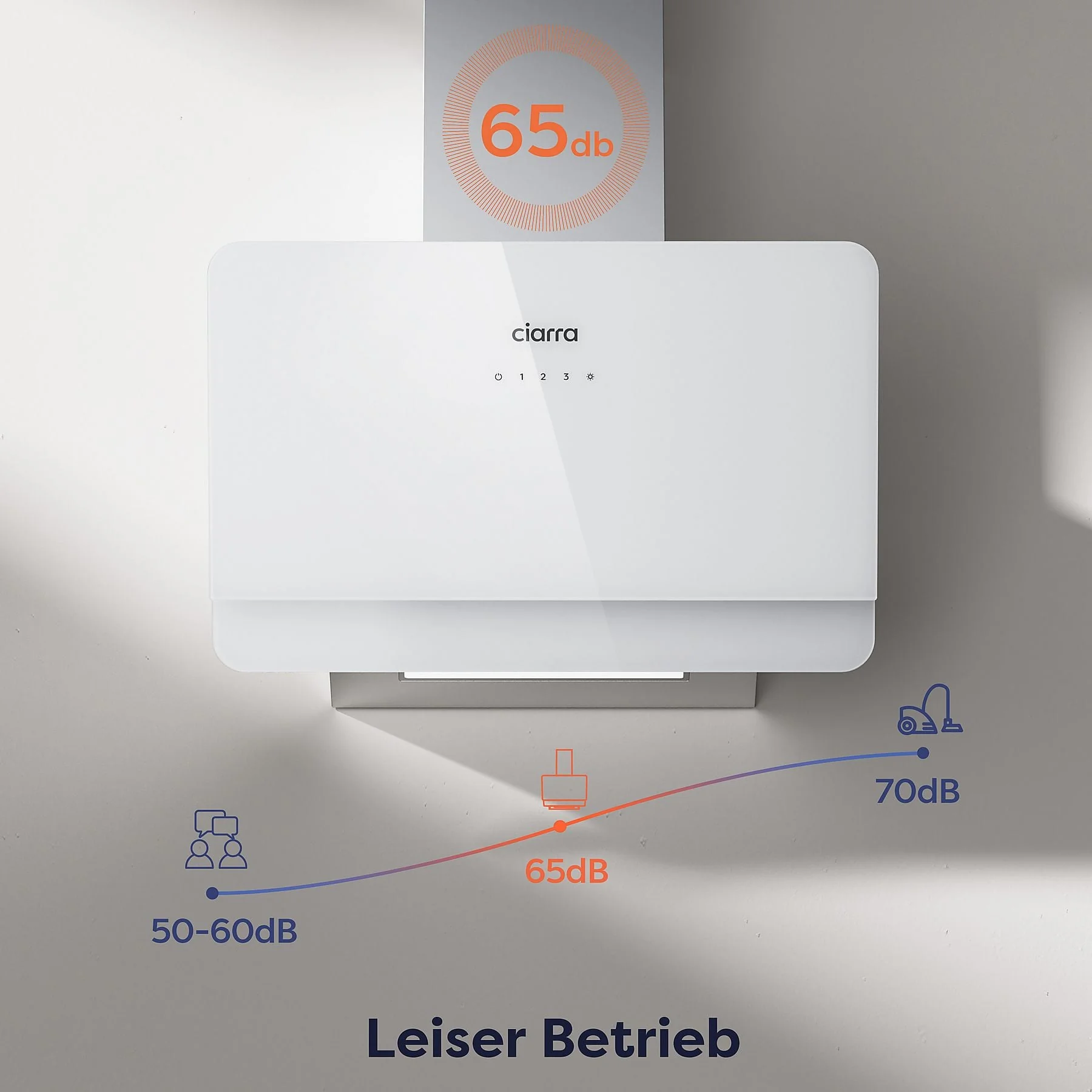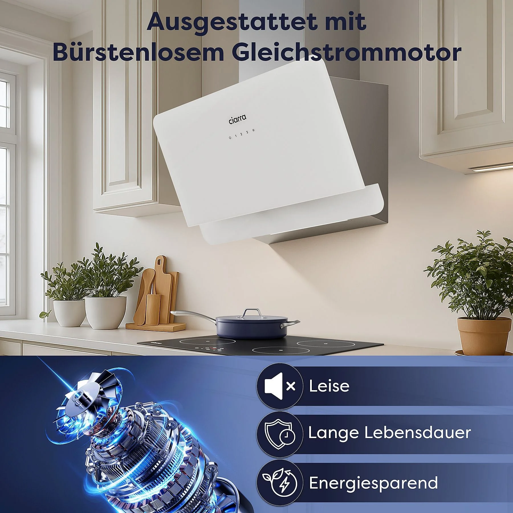 Diese schräge CIARRA Dunstabzugshaube kombiniert eine klare Bedienlogik mit wirkungsvoller Filtertechnik für den täglichen Einsatz am Herd. Sie unterstützt sowohl Umluft- als auch Abluftlösungen und passt dank 60 cm Breite in viele Küchenlayouts. Funktionen wie Touch-Control, LED-Licht und ein bürstenloser Motor runden das Konzept ab und schaffen eine ausgewogene Lösung für das Entlüften beim Kochen.