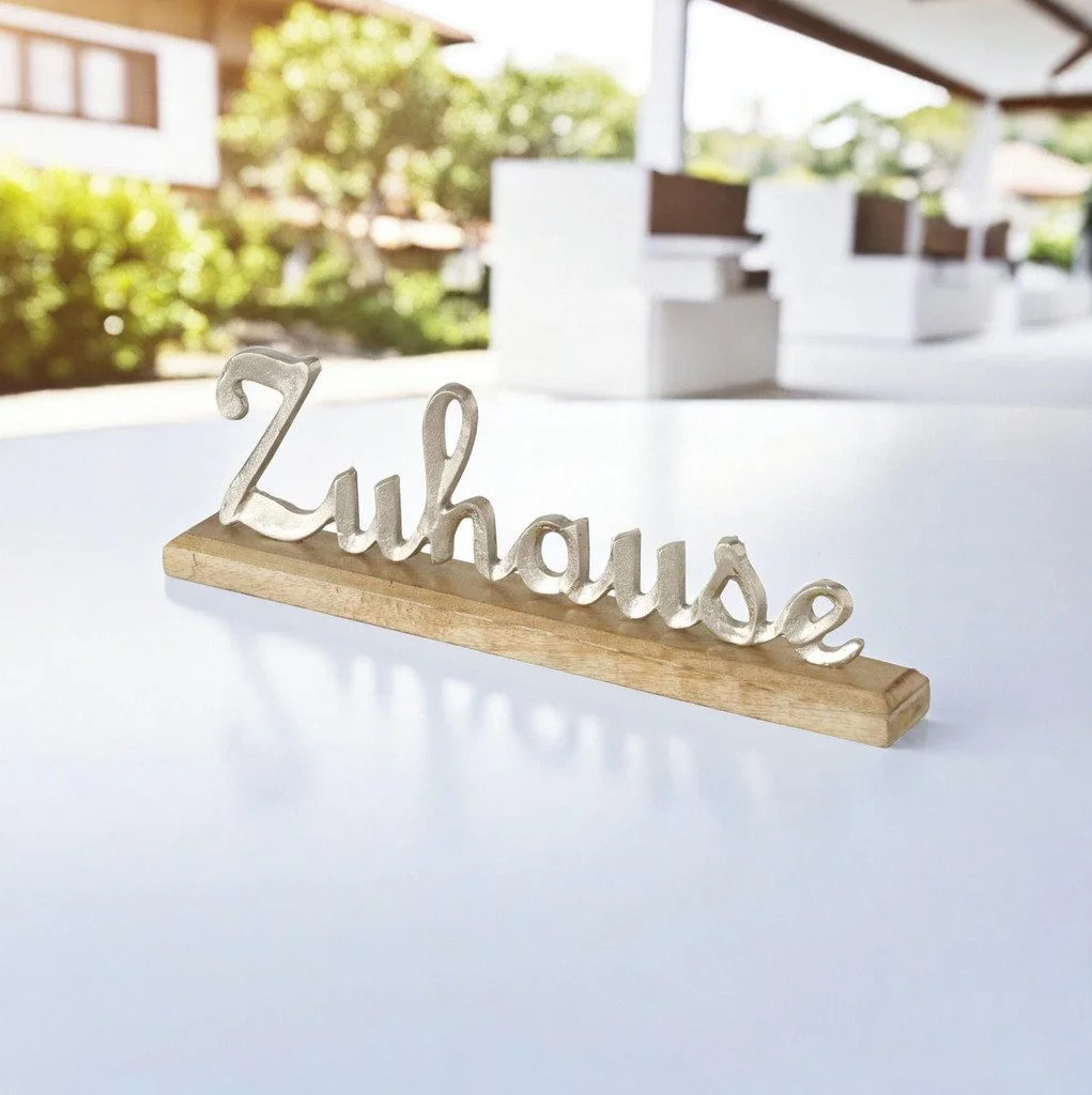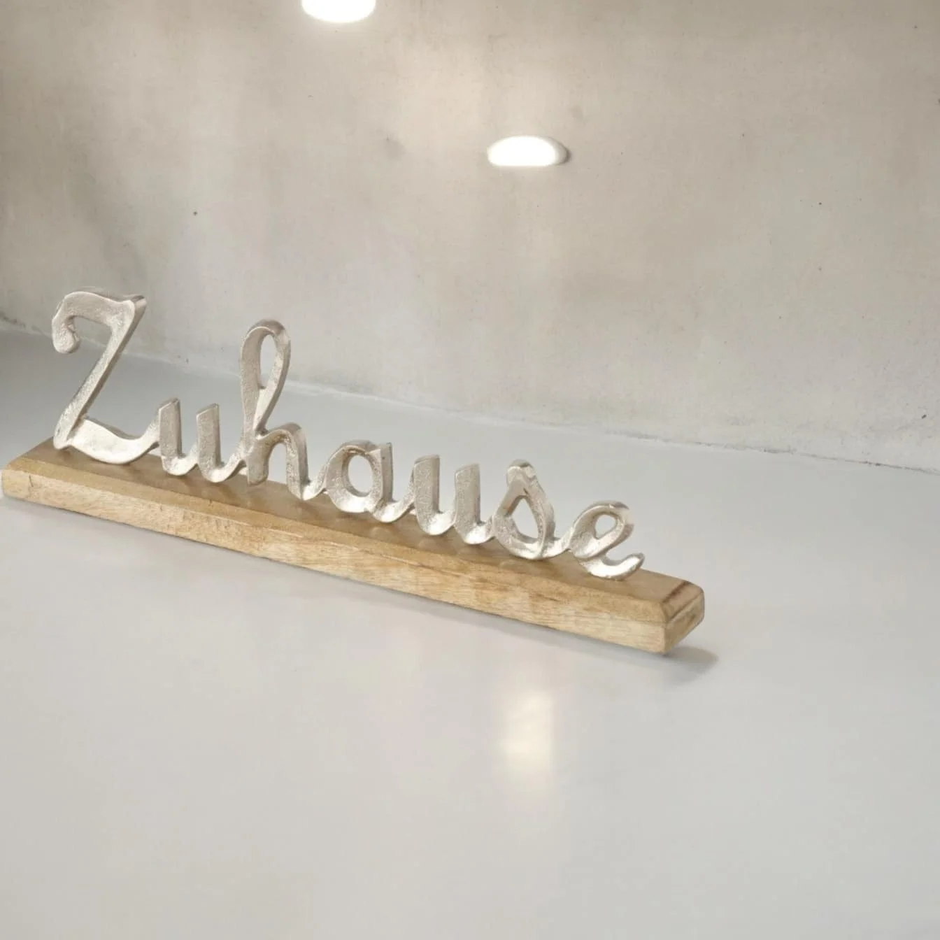 Dieser dekorative Schriftzug „Zuhause“ kombiniert silberfarbenes Metall in geschwungener Schreibschrift mit einem natürlichen Holzsockel. Der moderne 3D-Aufsteller bringt eine stilvolle, einladende Atmosphäre in jeden Wohnraum und setzt einen eleganten Akzent auf Kommoden, Sideboards, Regalen oder im Eingangsbereich.