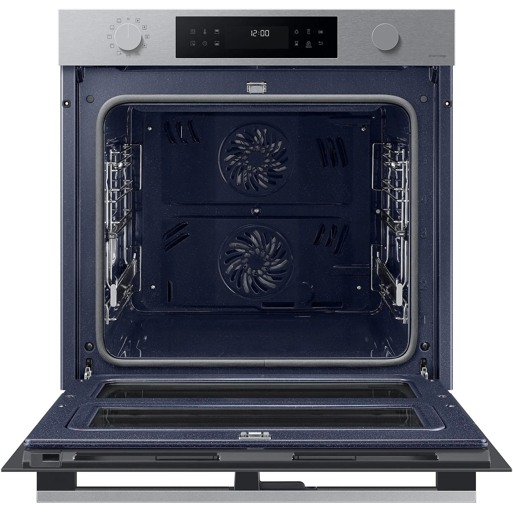 Der Samsung Einbaubackofen NV7B4550VAS/U1 aus der Serie 4 kombiniert einen großen 76‑Liter‑Garraum mit der Dual Cook Flex™ Technik: Ein Garraumteiler, zwei Heißluftsysteme (je 1.200 Watt) und zwei Ventilatoren ermöglichen paralleles Garen mit unterschiedlichen Temperaturen, Betriebsarten und Zeiten. Der obere Bereich lässt sich kontrollieren, ohne den unteren zu öffnen. Geruchs- und Geschmacksübertragungen zwischen den getrennten Bereichen werden dabei vermieden. Ergänzt wird das Konzept durch pyrolytische Selbstreinigung, SmartThings Cooking Anbindung und Air Sous Vide für konstante Temperaturen über längere Zeiträume.