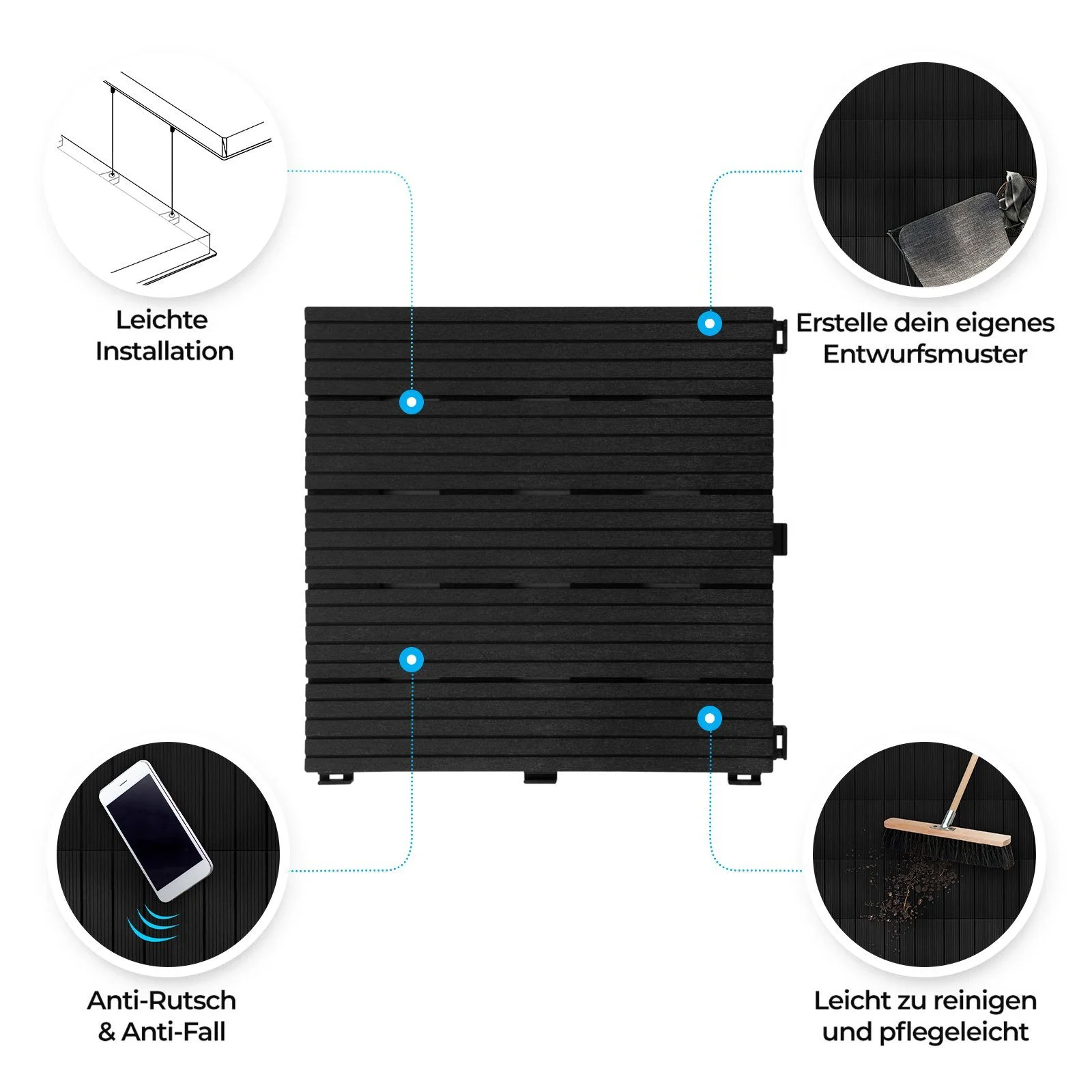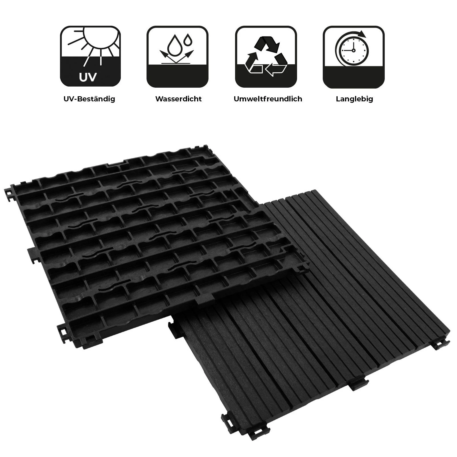 Das robuste Material ist widerstandsfähig, UV-beständig und unempfindlich gegenüber Pilzen und Schädlingen. Ein Unterbau aus Kunststoff mit Drainagefunktion sorgt dafür, dass Wasser schnell abfließen kann – optimal für ganzjährige Nutzung im Freien. Die Fliesen sind umweltfreundlich und behalten dauerhaft ihre Formstabilität.
