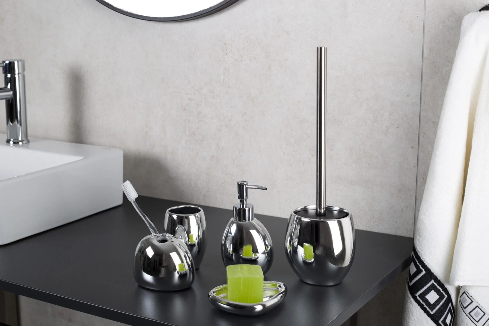Die matte Chrom-Optik sorgt für einen edlen und zeitlosen Look, der sich harmonisch in moderne Bäder einfügt. Hergestellt aus hochwertigem Polyresin, ist der Becher stabil, pflegeleicht und langlebig.